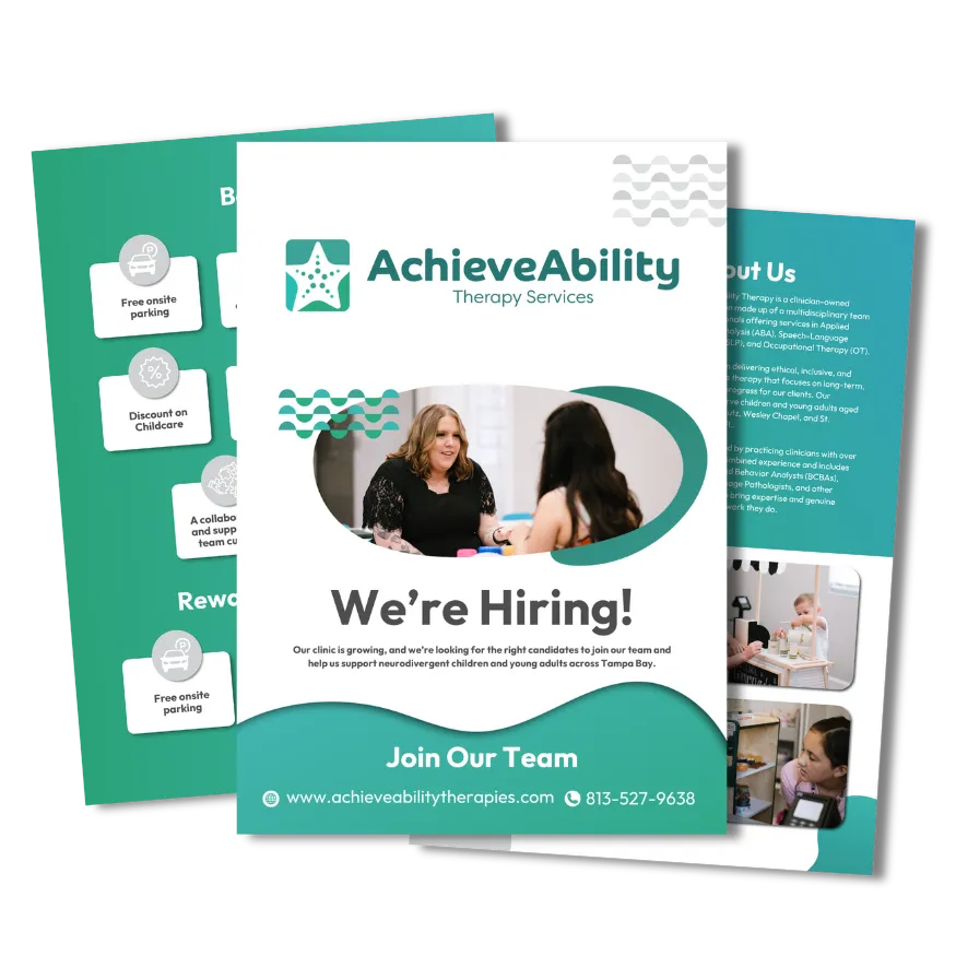 At AchieveAbility Therapy, we provide inclusive, evidence-based therapeutic care to neurodivergent children and young adults aged 2–21. Our services include Applied Behavior Analysis (ABA), Speech-Language Therapy, and Occupational Therapy. Our collaborative, multidisciplinary team works together to support the whole child across home, school, and community environments.